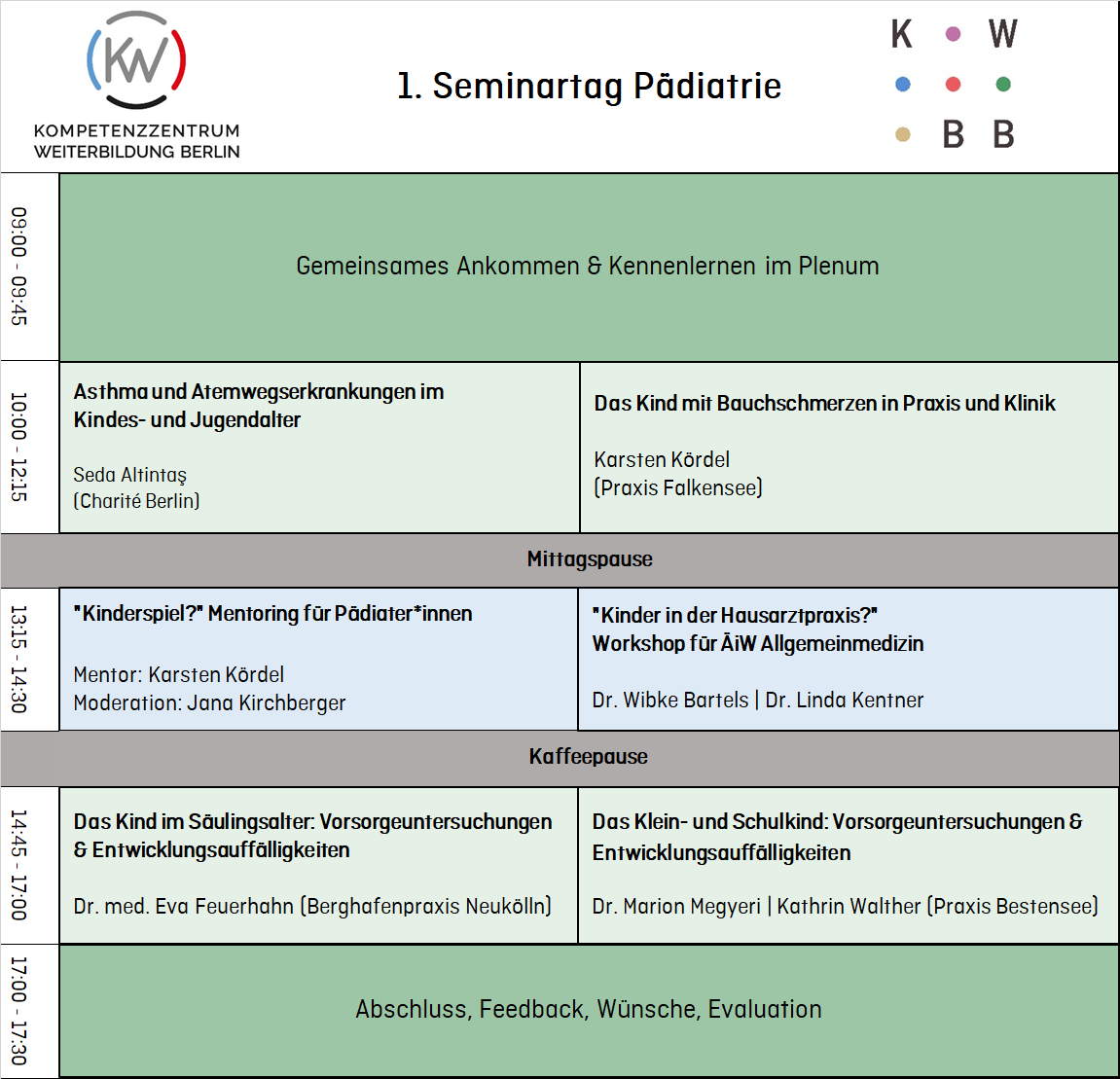 Dies ist ein interdisziplinäres Seminar für ÄiW Pädiatrie und Allgemeinmedizin. Es wird in Kooperation mit dem KW-Berlin veranstaltet.