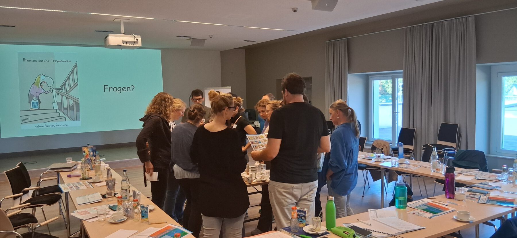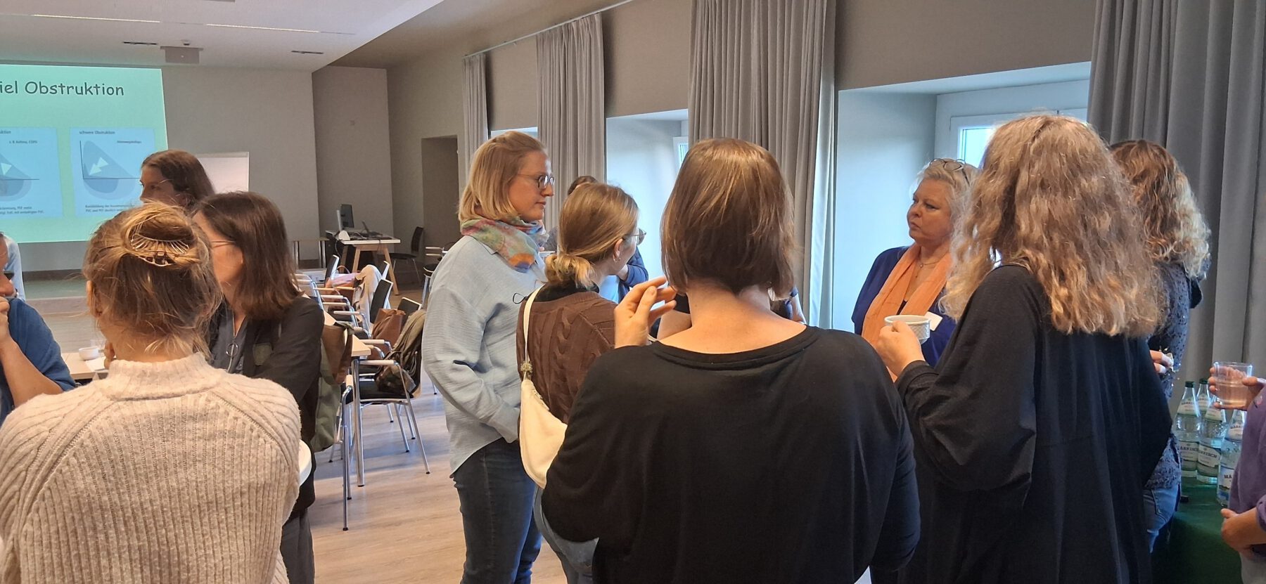 Der Samstag begann nach der morgendlichen Begrüßung durch Bürgermeister Christian Schroeder mit zwei parallelen Workshops: Anja Wüstneck und Sabrina Bölke führten durch das Seminar „Atemlos durch das Asthma- und COPD-Dickicht“. Die Teilnehmenden konnten in Übungen das Symptom Luftnot erspüren, verschiedene Devices austesten, selbst eine Spirometrie durchführen und auch das theoretische Wissen auffrischen. Währenddessen trainierten Dr. Veronika Rufer und Johanna Martin im Kommunikationsseminar „Die Welt gerät aus den Fugen … und wir Ärztinnen erleben Hilflosigkeit und Überforderung“ mit den Ärztinnen und Ärzten das Überbringen schlechter Nachrichten. Nach der Kaffeepause folgten am Nachmittag weitere praxisnahe Seminare: Anja Wüstneck vermittelte in „In 90 Minuten zum DMP-Champion“ wichtiges Wissen zu Disease Management Programmen, parallel dazu bot Moritz Freisleben das Seminar „Einfach gynial! – Nützliches aus der Frauenheilkunde für die hausärztliche Praxis“ an. Alle Seminare kombinierten theoretischen Input mit praktischen Übungen und boten konkrete Handlungsempfehlungen für den hausärztlichen Alltag.